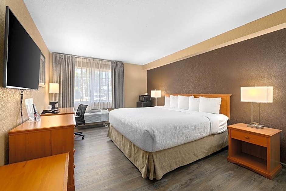 This accessible room features a flat-screen TV, coffee maker, and private bathroom with a hairdryer.
